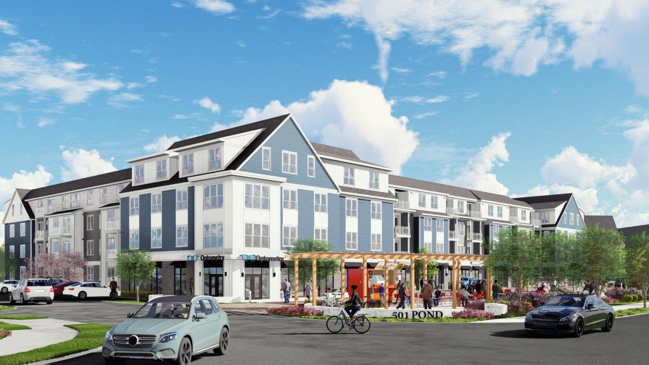 501 Pond Street is a 125-unit workforce housing project located in Ashland, MA. Nestled in the suburban countryside of Central Massachusetts, the project adds housing to one of Ashland's commercial districts. The building design incorporates the traditional New England style with gabled roofs, trim elements, and lap siding. The front yard of the project includes a Woonerf to activate the street edge, providing an active space for social interaction. The southwest corner of the building includes two retail spaces that spill out onto the Woonerf. The amenity space for residents consists of a mail & package area, work pods, a large fitness space, clubroom, pet spa, and rentable dining areas. In the courtyard, a central game lawn, patio with ample seating and grill stations, and swing area provide an outdoor retreat for residents.
