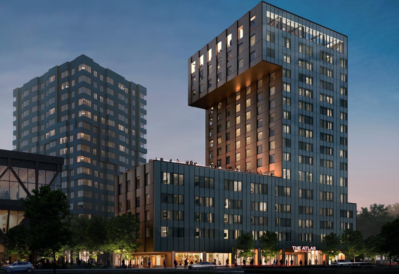 The Atlas Hotel is part of the Enterprise Research Campus. The 17 story tower has over 240 guest rooms, and is connected to the Verra residential building by a one-story corridor that holds a number of amenities.