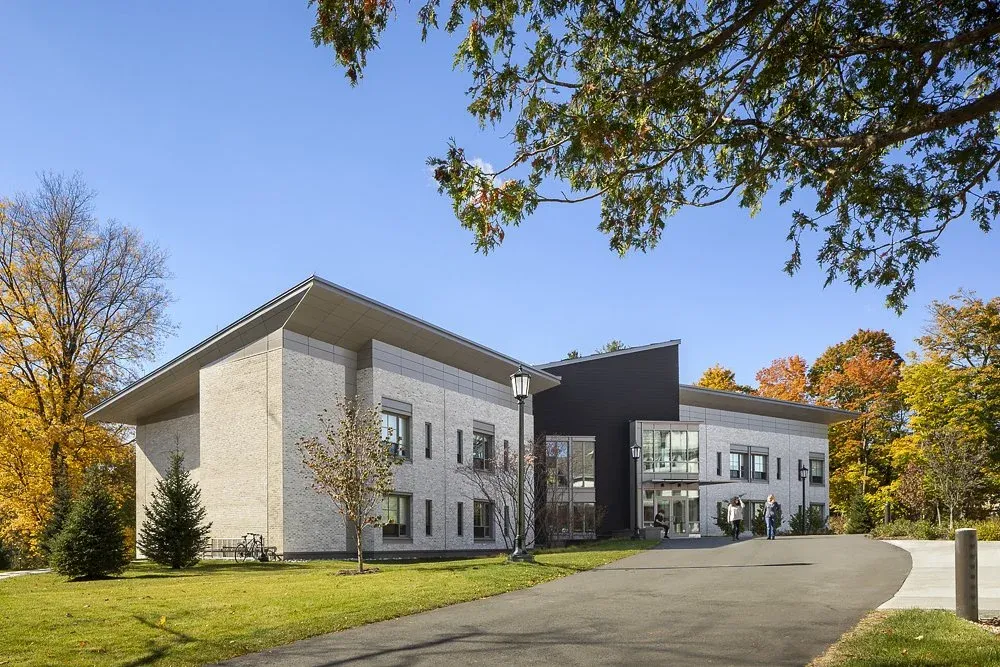 The new residence hall includes an ambitious environmental agenda, particularly given the location, as the CDE residence is designed to be the first Net Zero energy building on the Williams College campus. The roof supports over 300 PV cells, while 12 geothermal wells and VRF heat pumps contribute to energy efficiency for both heating and cooling. Each room is equipped with LED lighting, occupancy sensors, and efficient valence units. Sustainable materials are used throughout, and the envelope, designed to rigorous Passive House standards is super-insulated. Triple glazed windows, generously sized to compensate for winter daylight, offer views of the CDE academic building and the surrounding landscape, which includes rain gardens for storm water management.