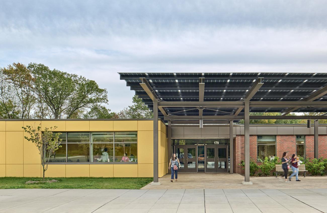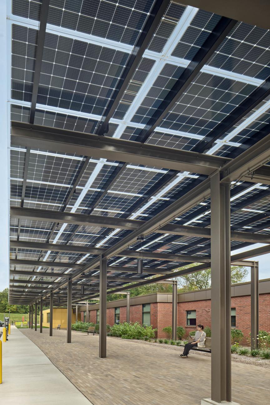 Keeney Elementary, Manchester Public School's third renovate-as-new net zero energy school, serves 300 students in grades K-4. Notable features include a geothermal wellfield, a modern main entrance covered by a transparent photovoltaic panel canopy, and an enclosed courtyard with a sundial, providing natural daylighting to interior spaces.