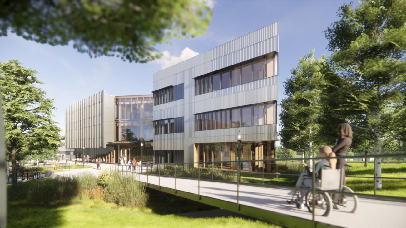 The new Manning College of Information and Computer Sciences building added a multi-story, low-carbon mass-timber facility between the existing CICS buildings on Governors Drive, expanding classrooms, research labs, and collaboration spaces for computing.