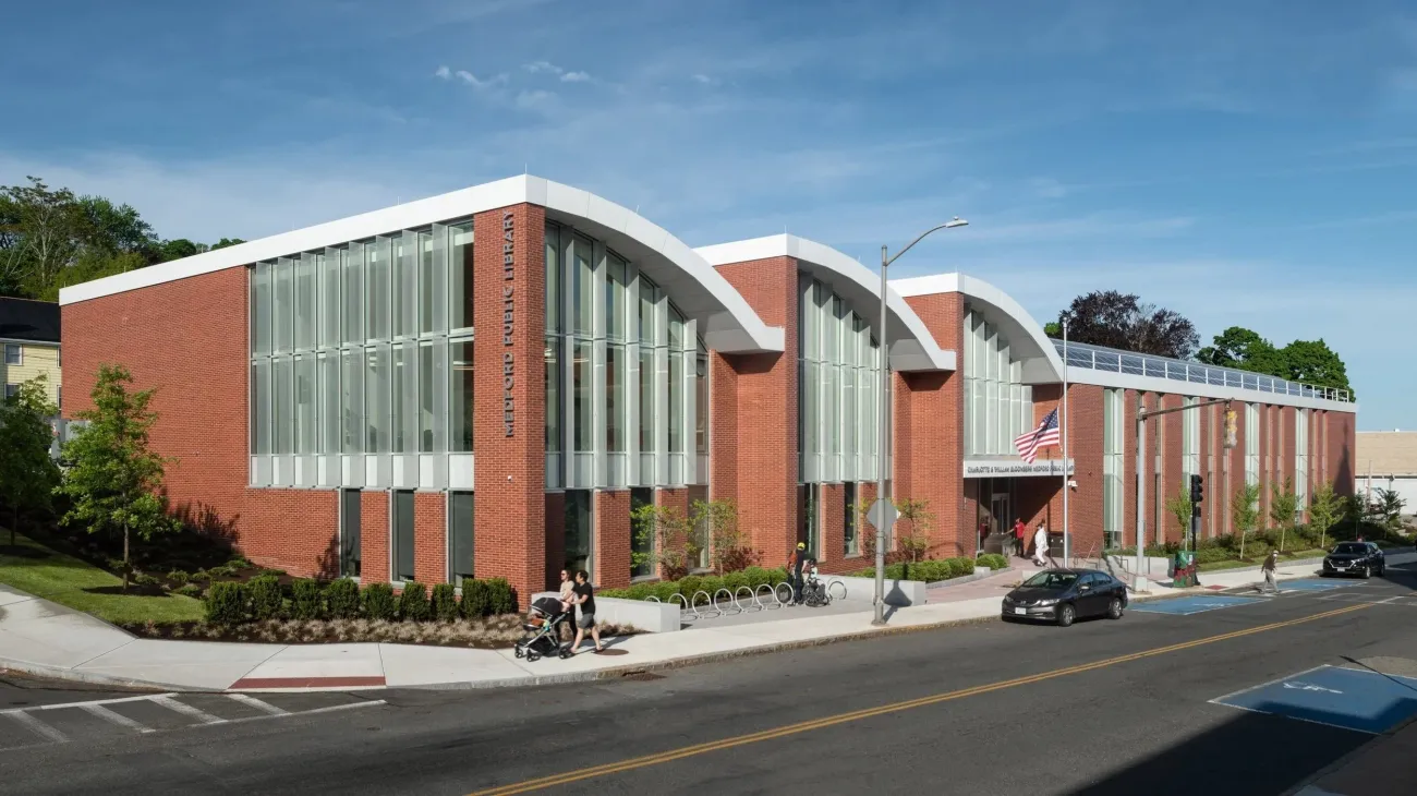 The library offers the residents of Medford a 100-person multi-purpose meeting room; a maker space; a tech lab; a local history room; separate reading rooms for adults, teens, and children; and other amenities. The building’s curved roof forms and plank-lined ceilings are inspired by Medford’s rich history as a clipper ship manufacturing hub, as well as the desire of the city to produce renewable energy, which was achieved with over 600 solar panels installed on the curved roofs. The project is among the first public libraries in the Commonwealth to achieve net-zero energy usage on site.